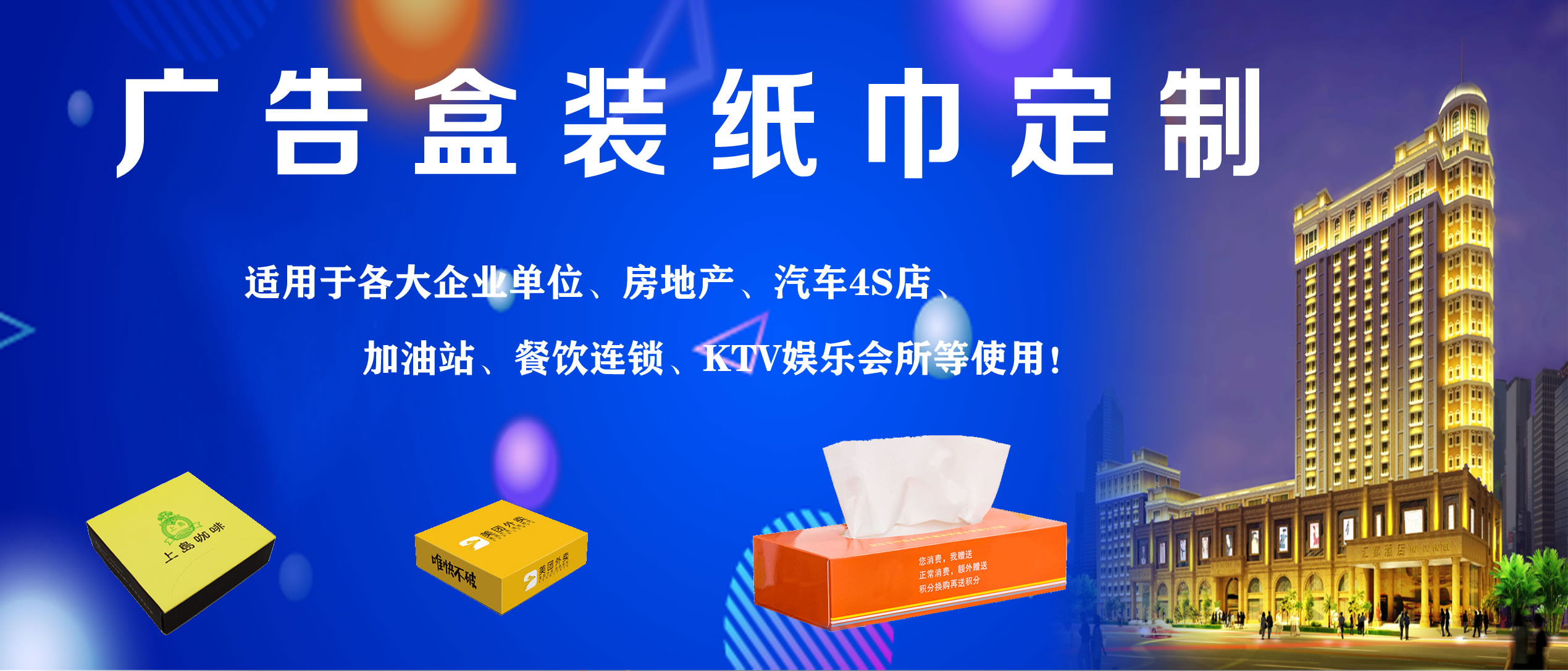 合肥億竹紙品包裝有限公司是一家專(zhuān)業(yè)從事各種生活用品定制的企業(yè),定制熱線(xiàn):18919603840(周經(jīng)理)。公司與各大餐飲行業(yè)、酒店、加油站、學(xué)校、KTV娛樂(lè)會(huì)所、銀行、汽車(chē)4S店、房地產(chǎn)、廣告公司等客戶(hù)長(zhǎng)期合作,業(yè)務(wù)覆蓋安徽全省。公司主營(yíng)產(chǎn)品:廣告盒抽定制、餐巾紙定制、大盤(pán)紙、擦手紙、散抽紙等。有著完善的生產(chǎn)硬件設(shè)備和專(zhuān)業(yè)技術(shù),及長(zhǎng)期從事的豐富經(jīng)驗(yàn)。 我廠(chǎng)專(zhuān)注生活用品多年,致力于生產(chǎn)“精致,高端,綠色,健康”于一體的優(yōu)質(zhì)產(chǎn)品,以誠(chéng)信、實(shí)力和產(chǎn)品質(zhì)量獲得業(yè)界的認(rèn)可。目前我廠(chǎng)產(chǎn)品已深得寶馬汽車(chē)、重慶劉一手火鍋餐飲連鎖、萬(wàn)達(dá)集團(tuán)、綠地集團(tuán)等眾多客戶(hù)的青睞,業(yè)務(wù)量不斷攀升。